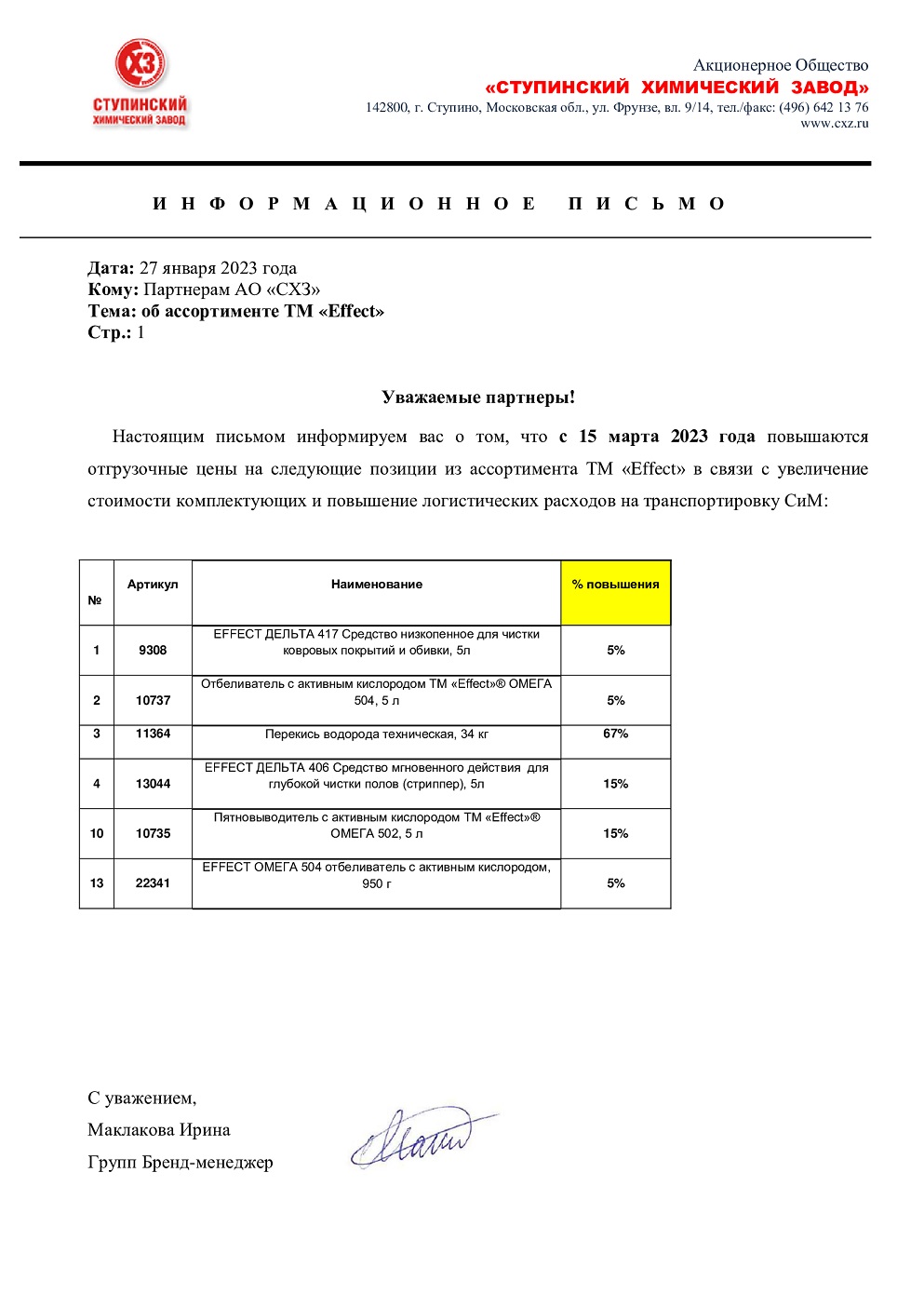 с 15 марта 2023 года повышаются цены на следующие позиции из ассортимента ТМ «Effect»: