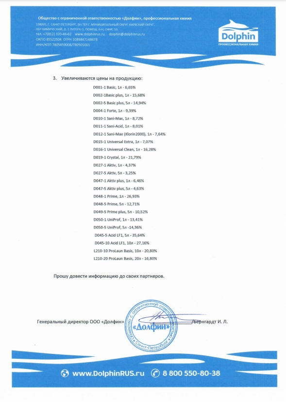 С 15 Января 2024 года меняются цены на ряд товаров профессиональной химии для уборки торговой марки Долфин (Dolphin).
