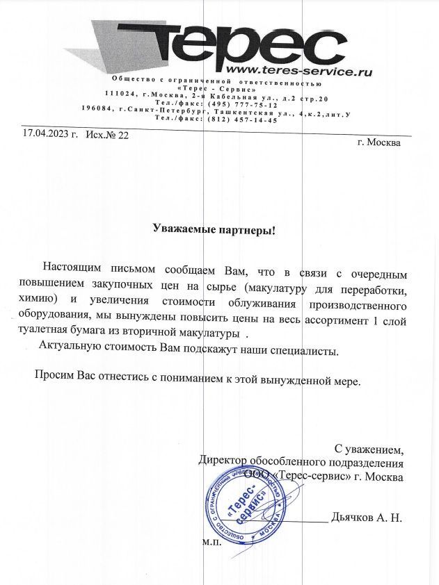 Повышается цена на 1-слойную туалетную бумагу из вторичной макулатуры торговой марки Teres.